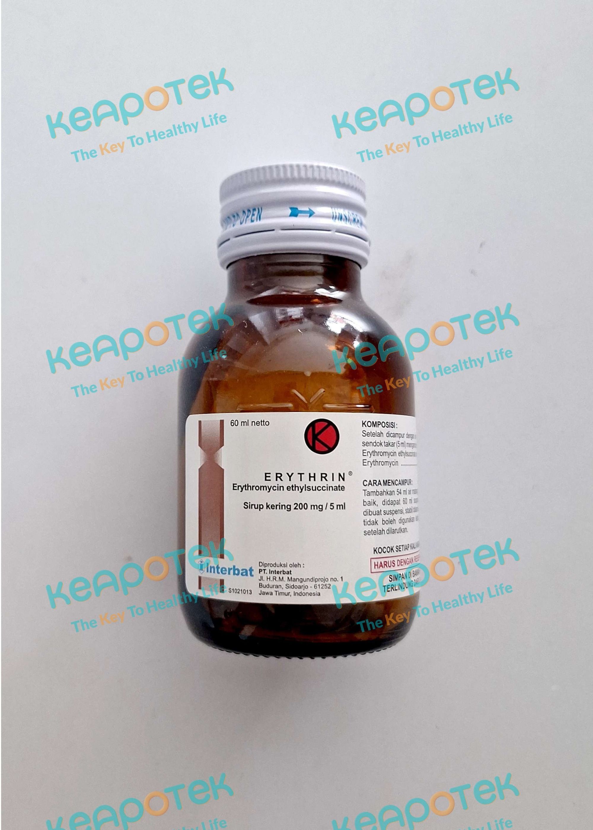 Erythrin 200 mg adalah antibiotik yang mengandung zat aktif erythromycin ethylsuccinate 200 mg. Erythromycin merupakan antibiotika yang bekerja dengan cara menghambat sintesa protein bakteri dan terikat pada sub unit ribosom 50 S mikroorganisme yang sensitif. Ikatan antara Erythromycin dan ribosom bakteri bersifat reversibel dan hanya terjadi jika sub unit 50 S bebas dari molekul t-RNA. Obat ini bersifat bakteriostatik atau bakterisid tergantung pada konsentrasi obat, sensitivitas mikroorganisme, kecepatan pertumbuhan dan besarnya inokulum. Erythromycin terdifusi hampir ke seluruh cairan tubuh. Erythromycin ditemukan pada cairan spinal dalam jumlah kecil, tetapi daya tembus obat melalui 'blood-brain barrier' meningkat pada keadaan meningitis. Pada keadaan fungsi hati normal, Erythromycin terkonsentrasi dalam hati dan diekskresikan melalui empedu. Efek disfungsi hati terhadap ekskresi Erythromycin oleh hati ke dalam empedu tidak diketahui. Erythromycin dapat menembus placenta barrier dan diekskresikan melalui ASI.
