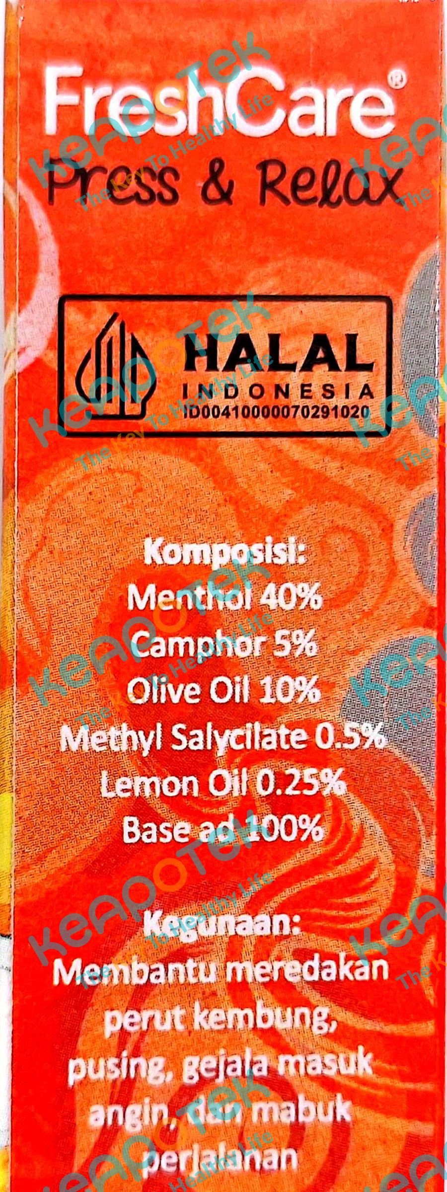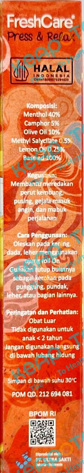 Freshcare Press & Relax Hot Strong mengandung menthol 40%, Camphor 5%, Olive Virgin Oil 10%, Methyl Salycilate 0.5%, Lemon Oil 0.25%, base ad 100% digunakan untuk meredakan perut kembung, pusing, masuk angin dan mabuk perjalanan. Produk ini mengandung olive oil sebagai anti iritasi bila dipakai berulang, Menthol dan camphor yang memberikan efek relaksasi.
