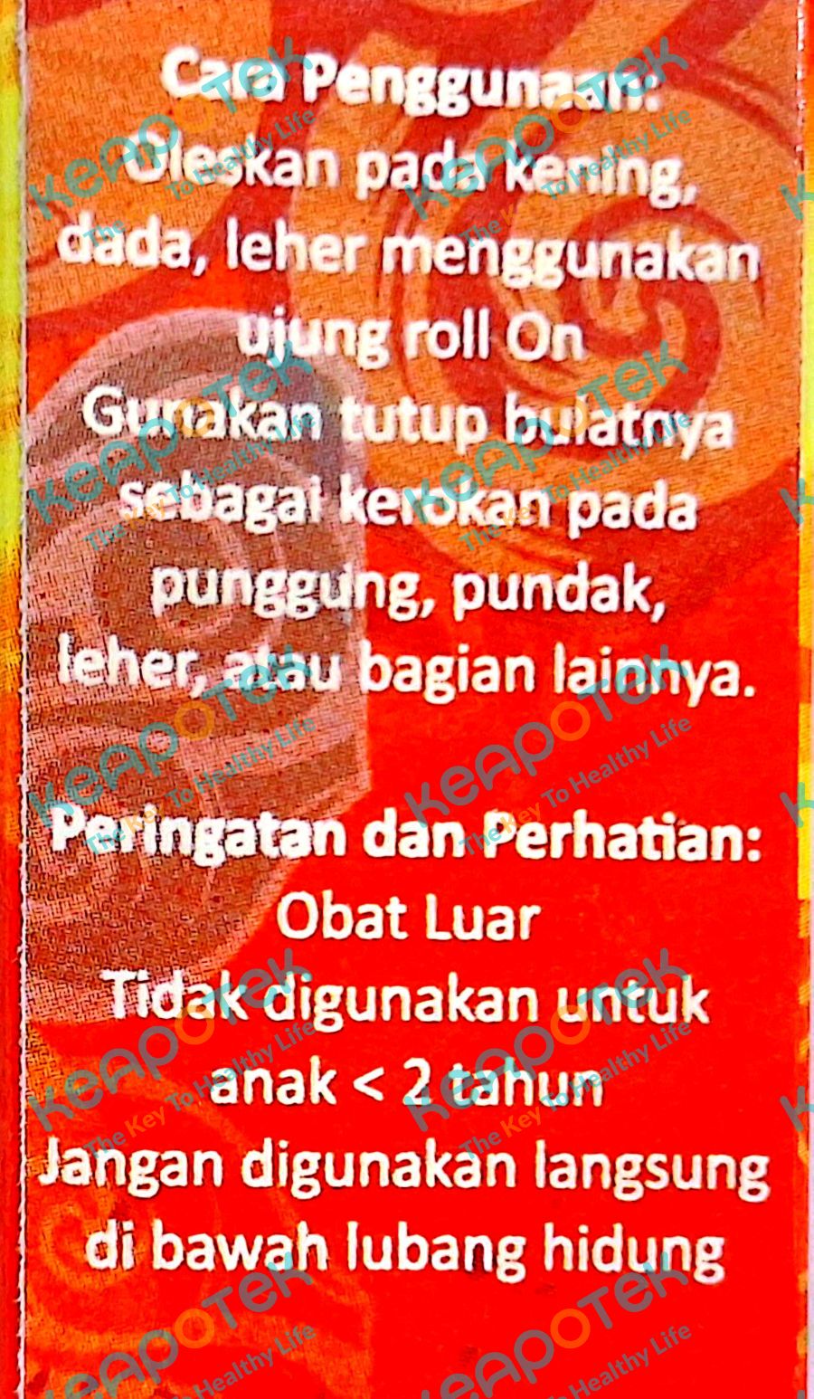 Oleskan pada kening, dada, leher menggunakan ujung roll on. Gunakan tutup bulatnya sebagai kerokan pada punggung, pundak, leher, atau bagian lainnya.