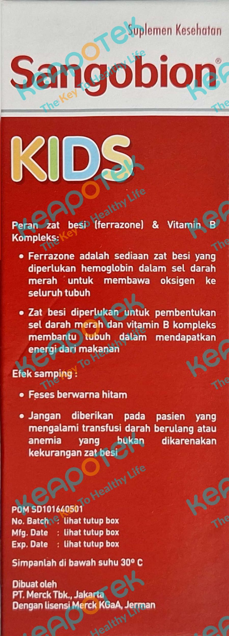Sangobion kids merupakan suplemen dengan kandungan Ferrazone, vit.B1, vit.B2, vit.B6, vit.B3, vit.B7 untuk membantu memenuhi kebutuhan zat besi dan vitamin di masa pertumbuhan anak diatas 2 tahun dengan rasa buah-buahan.