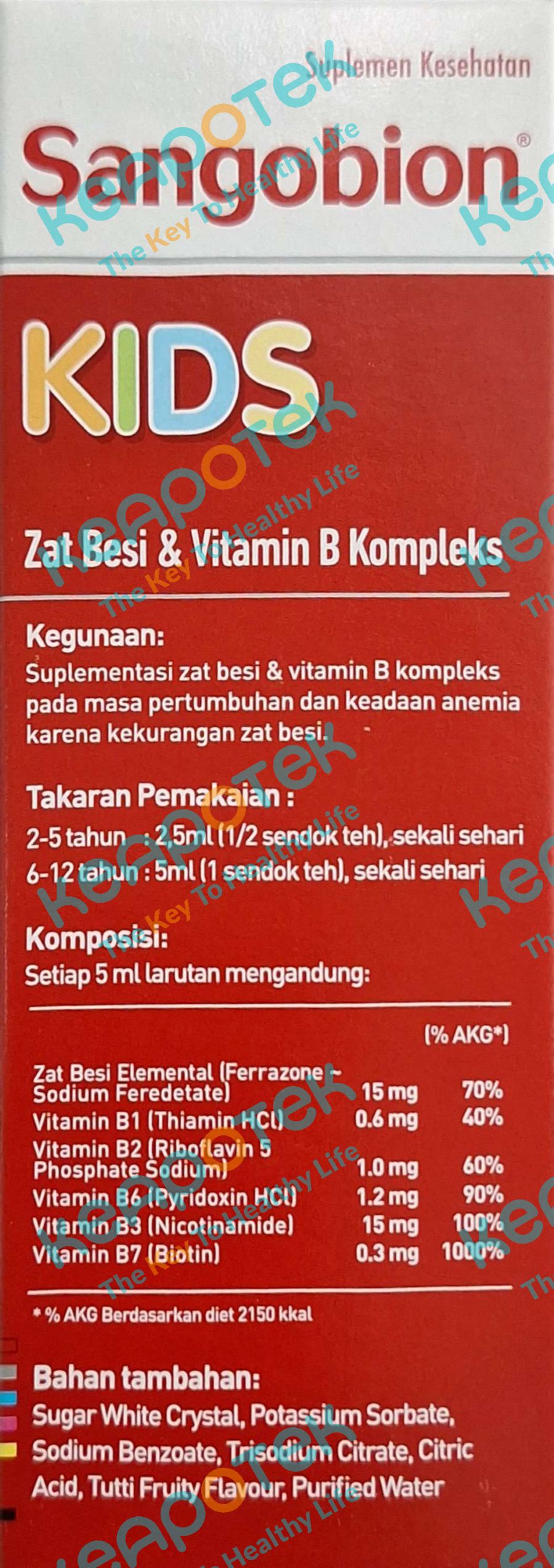 Dosis anak 2-5 tahun: 2,5 mL, sekali sehari. Dosis anak 6-12 tahun: 5 mL, sekali sehari. Aturan Pakai: Sebelum mengonsumsi suplemen sangobion kids perhatikan petunjuk yang sudah tertera pada kemasan, Gunakanlah suplemen sangobion kids setelah makan atau pada saat makan.
