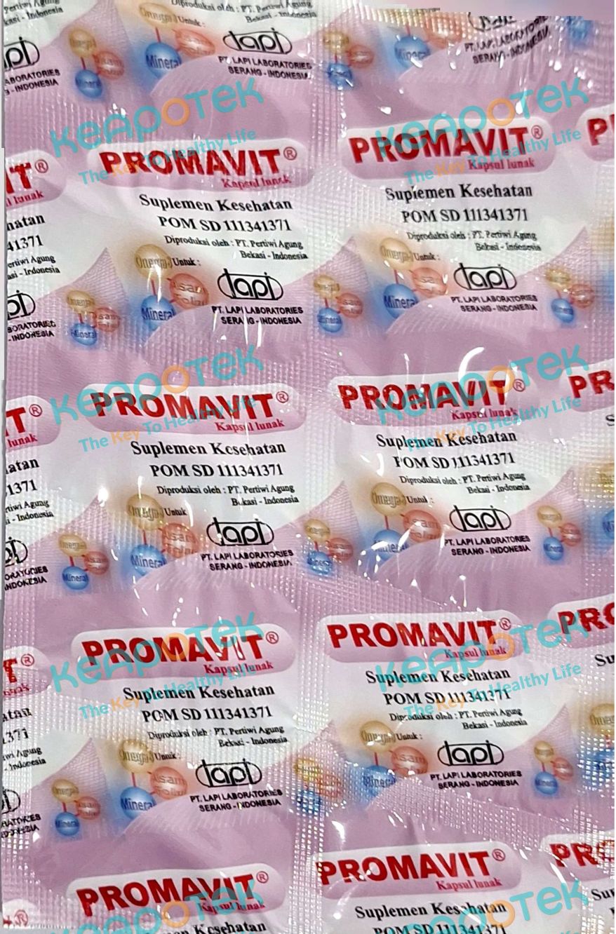 Promavit merupakan suplemen dengan kandungan Tuna oil 179 mg, Omega-3 64.5 mg, DHA 48.5 mg, EPA 12.5 mg, Folic Acids 400 mcg, vit.A 345 IU, vit.D3 34.5 IU, vit.B12 0.5 mcg, vit.B6 150 mcg, Ca Carbonate 100 mg, mg oxide 62.5 mg, Fe fumarate 23.5 mg yang digunakan untuk membantu memelihara kesehatan ibu hamil dan menyusui.