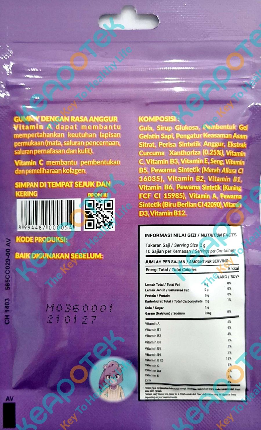 Dosis dan Aturan pakai: 1-2 gummy per hari atau sesuai petunjuk pada kemasan.