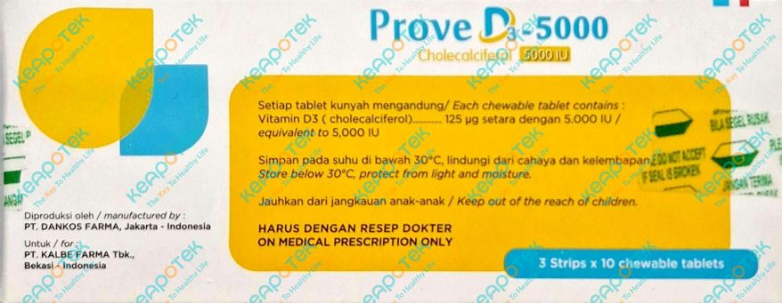 Prove D3 5000 merupakan suplemen dengan kandungan Vitamin D3 (cholecalciferol) 5000 IU yang digunakan untuk membantu memenuhi kebutuhan vitamin D dengan cepat pada kondisi seperti lanjut usia, ibu hamil dan menyusui, risiko tinggi atau penderita penyakit infeksi, atau penderita autoimun.