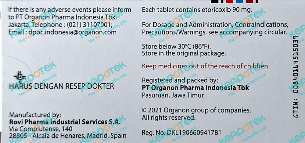 Arcoxia 90 mg merupakan obat dengan kandungan Etoricoxib 90 mg yang digunakan sebagai anti-inflamasi nonsteroid yang menunjukkan aktivitas anti-inflamasi, analgesik, dan antipiretik. Etoricoxib bekerja menghambat enzim COX-2 yang bertanggung jawab dalam produksi prostaglandin, zat yang menyebabkan rasa sakit dan peradangan di tubuh. Arcoxia cenderung memiliki efek samping yang lebih sedikit pada lambung dibandingkan AINS non-selektif terhadap COX-2 seperti ibuprofen atau diklofenak.
