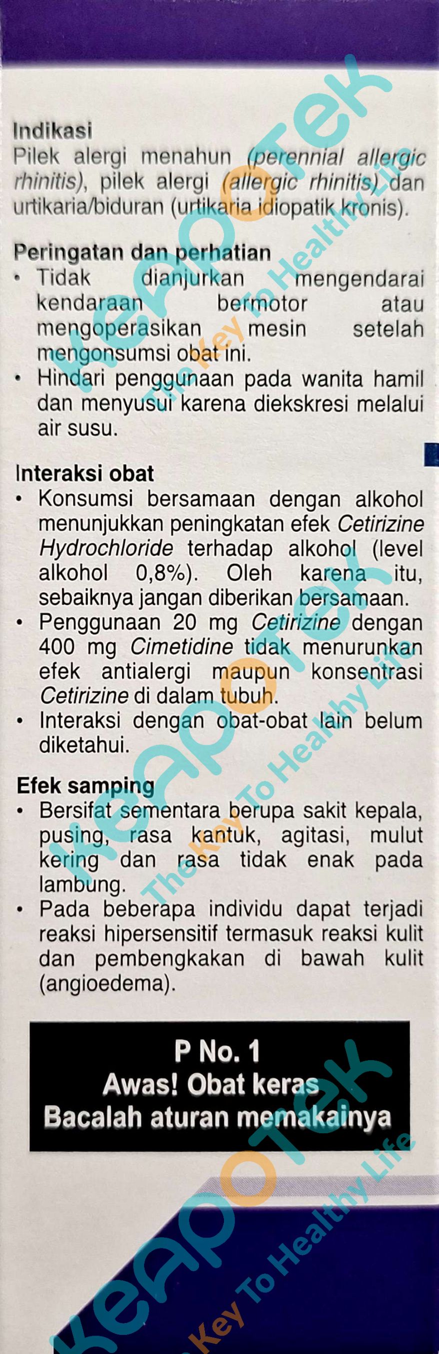 Sampaikan pada dokter atau apoteker jika memiliki riwayat alergi terhadap Cetirizine diHCl. Obat dapat menyebabkan rasa kantuk, hindari penggunaan obat saat berkendara atau melakukan kegiatan yang memerlukan kewaspadaan.
