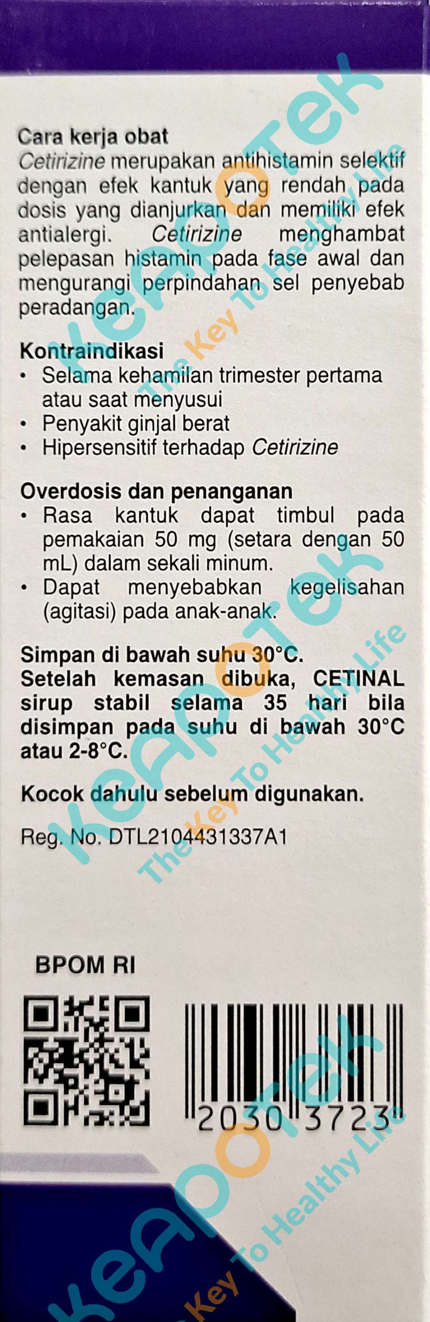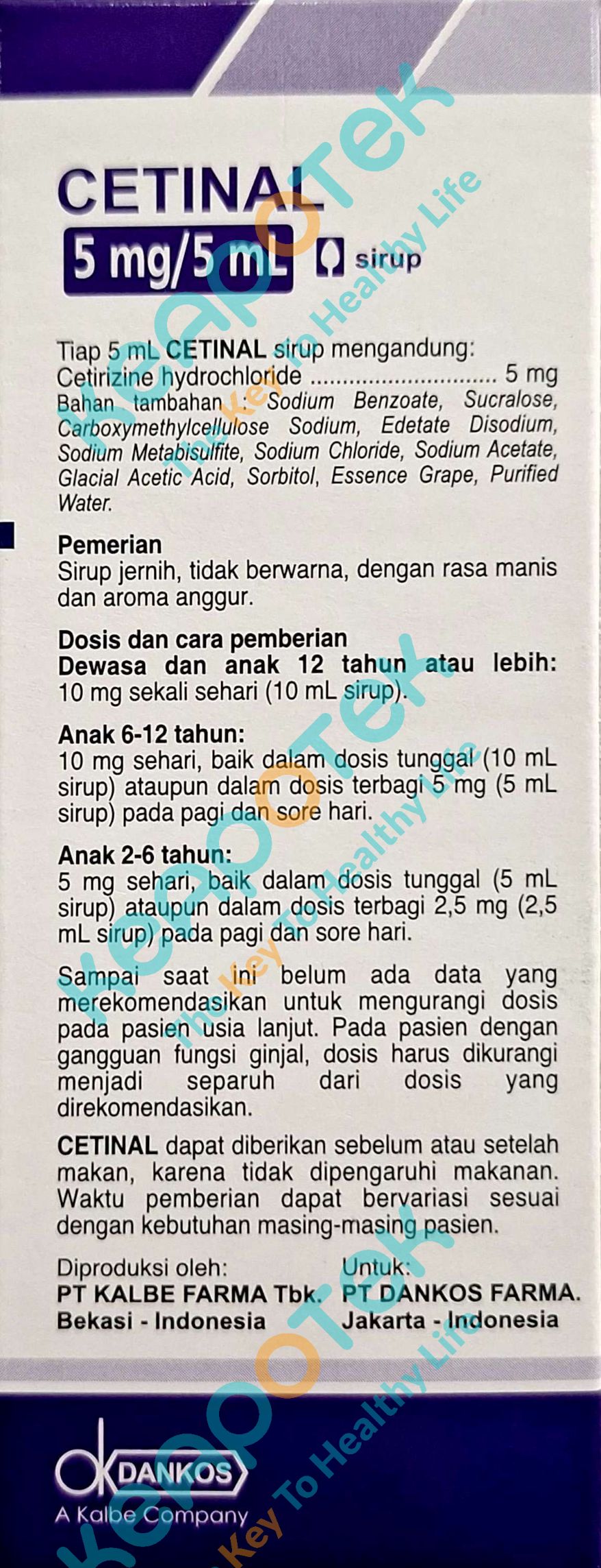 Cetinal Sirup merupakan obat antihistamin dengan kandungan Cetrizine dihydrochloride 5 mg/mL yang digunakan untuk mengatasi alergi seperti urtikaria, rhinitis alergi, bersin-bersin, dan hidung meler karena alergi. Cetirizine diHCl menghambat produksi histamin saat terjadi reaksi alergi dengan cara menghambat reseptor histamin pada saluran perncernaan, pembuluh darah dan saluran pernapasan.