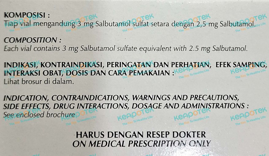 Dosis dewasa dan anak: Awal 2,5 mg, dapat diulangi sebanyak 4 kali sehari dengan nebulizer. Aturan pakai: Digunakan untuk nebulizer.