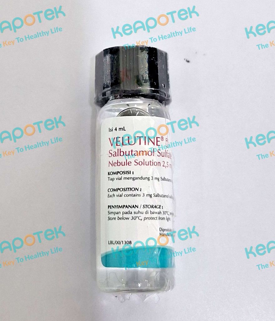 Velutine 2,5 mg merupakan obat dengan kandungan salbutamol sulfate yang digunakan untuk mengatasi dan mencegah serangan asma, pengobatan rutin dari bronkopasma akut yang tidak merespon terhadap terapi konvensional dan asma berat akut. Salbutamol merupakan agonis adrenoceptor beta2 selektif yang pada dosis terapeutik bekerja pada adrenoceptor beta2 dari otot bronkial kemudian terjadi bronkodilatasi dengan cepat (dalam 5 menit) dalam obstruksi saluran udara yang reversible.