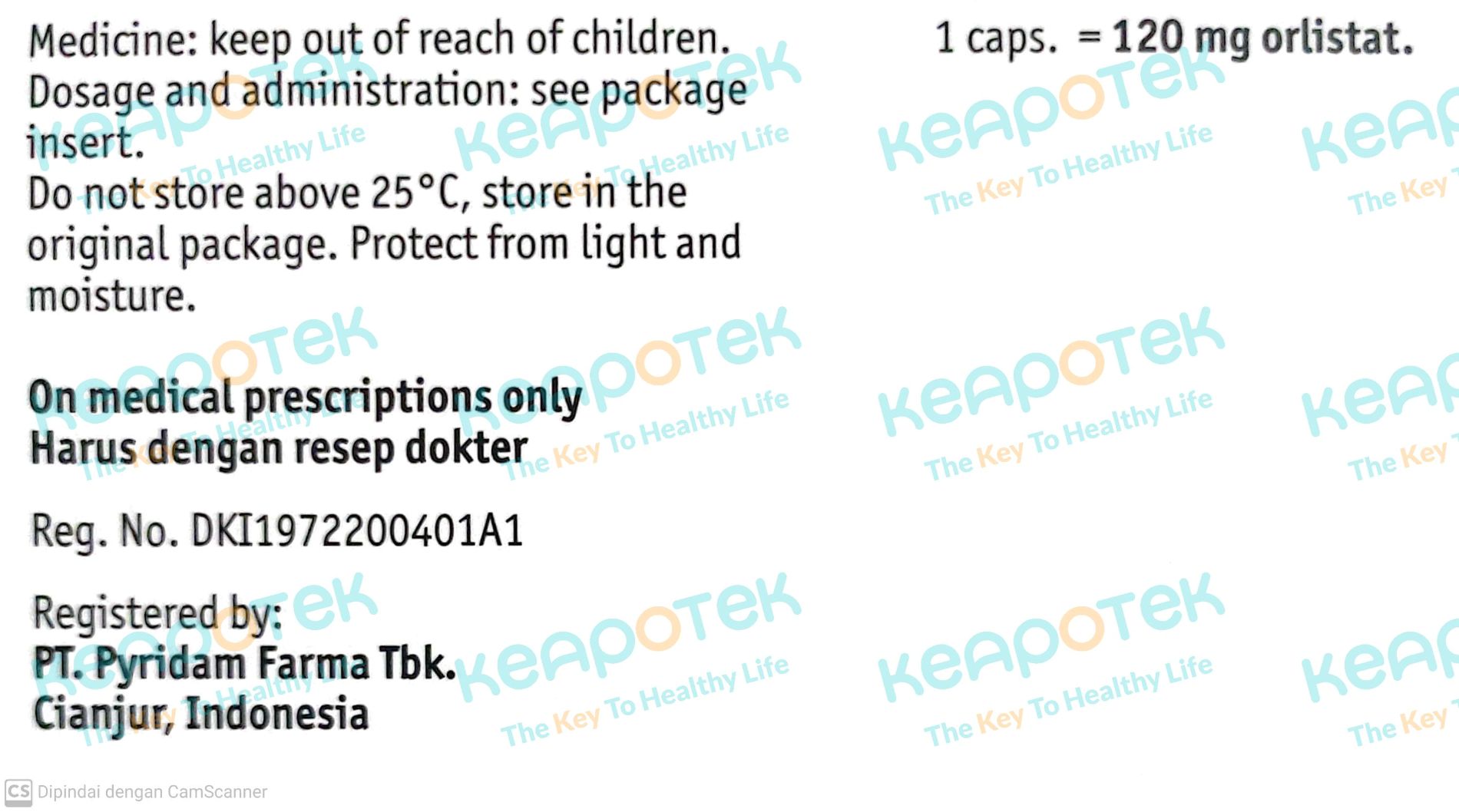 Dosis dewasa BMI ≥ 30 mg/m2 atau ≥ 27 kg/m2 dengan faktor risiko hipertensi, diabetes, dislipidemia: Sehari 3 kali, 120 mg setiap makan. Dosis dewasa ≥ 28 kg/m2 tanpa faktor risiko: Sehari 3 kali, 60 mg. Aturan pakai: Dikonsumsi saat makan.