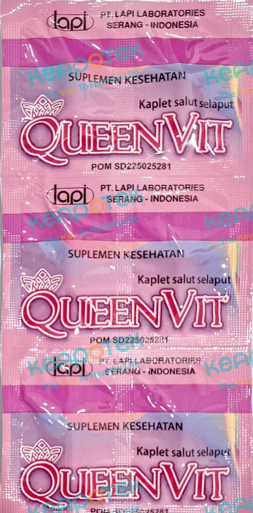 Queenvit digunakan untuk membantu memenuhi kebutuhan mikronutrien untuk membantu kesehatan pada wanita. Tiap kaplet salut selaput Queenvit mengandung Inositol 100 mg, L-arginine 50 mg, Zn sulphate monohydrate 7,5 mg, Mg oxide 62,5 mg, Tris chromium picolinate 100 mcg, Na selenite 100 mcg, Ferrous fumarate 10 mg, Mangan II sulphate monohydrate 1,5 mg, Cu gluconate 750 mcg, K iodide 50 mcg, Vit D3 200 IU, Vit E 25 mg, Vit C 75 mg, Vit A 1250 IU, folic acid 400 mcg, cyanocobalamine 100 mcg, thiamine nitrate 5 mg, Pyridoxine HCl 10 mg, Riboflavin 2,5 mg, nicotinamide 22,5 mg, PABA 12,5 mg.