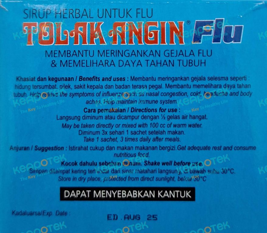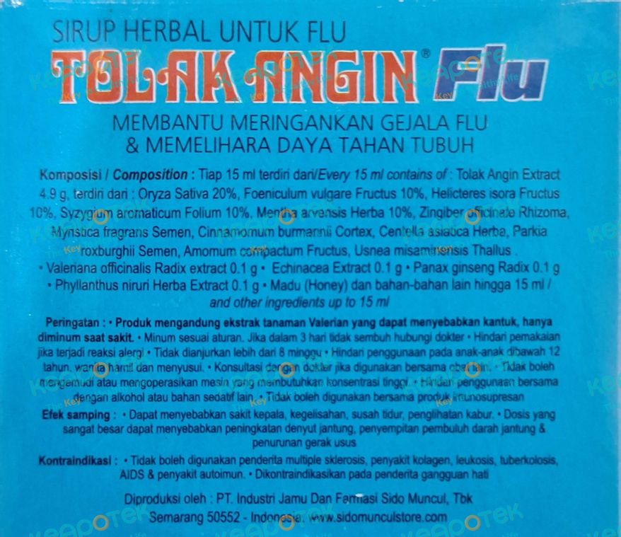Sampaikan pada dokter atau apoteker jika memiliki riwayat alergi dan timbulnya efek samping saat mengonsumsi Tolak angin flu. Hentikan penggunaan jika terjadi reaksi alergi atau timbul efek samping yang merugikan. Tidak dianjurkan digunakan lebih dari 8 minggu.
