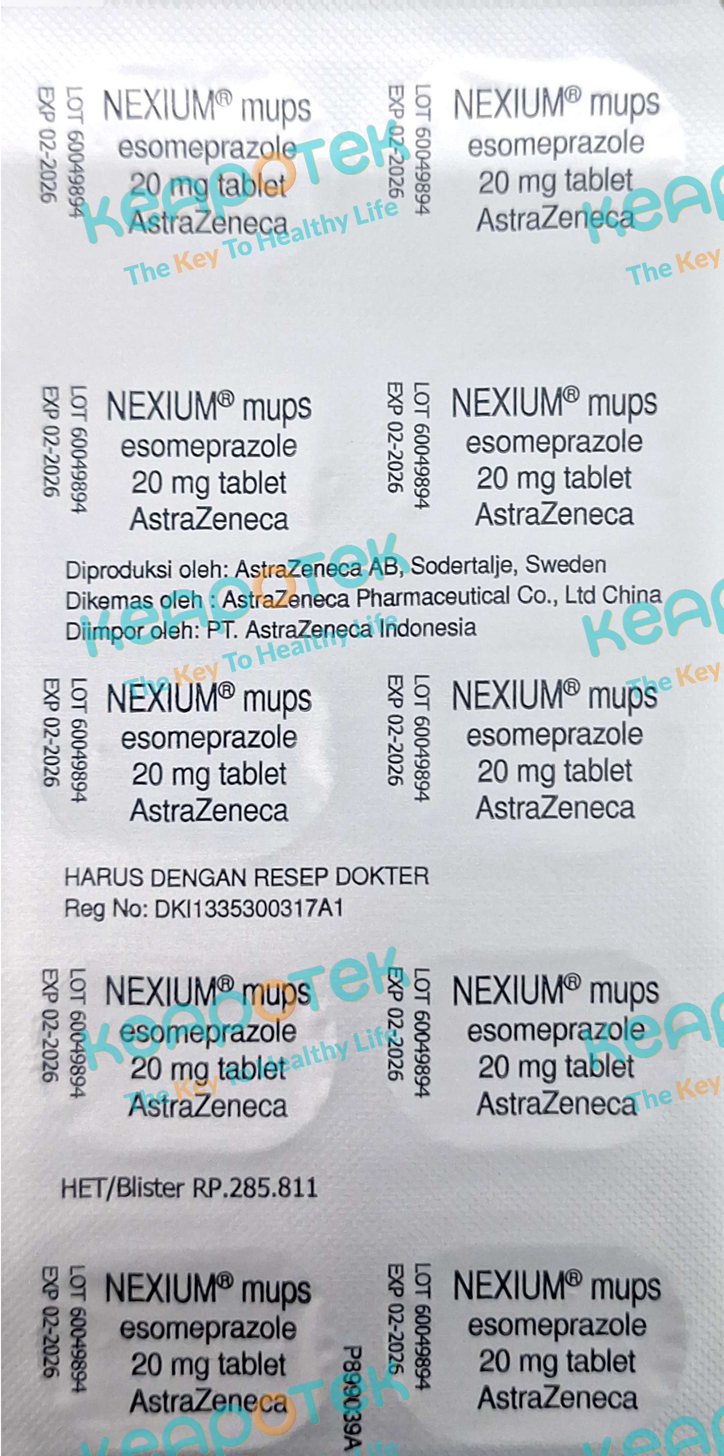 Nexium 20 mg merupakan obat dengan kandungan Esomeprazole 20 mg yang digunakan untuk mengobati kondisi yang disebabkan oleh keasaman berlebih dalam perut, seperti tukak lambung atau duodenum, penyakit refluks yang juga dikenal dengan Heartburn dan sindrom Zollinger-Ellison. Esomeprazole merupakan S-isomer dari omeprazole, pengganti benzimidazole proton pump inhibitor (PPI) yang menghalangi langkah terakhir dalam sekresi asam lambung oleh penghambat spesifik sistem enzim H+/K+-ATPase yang terdapat pada permukaan sekresi sel parietal lambung.