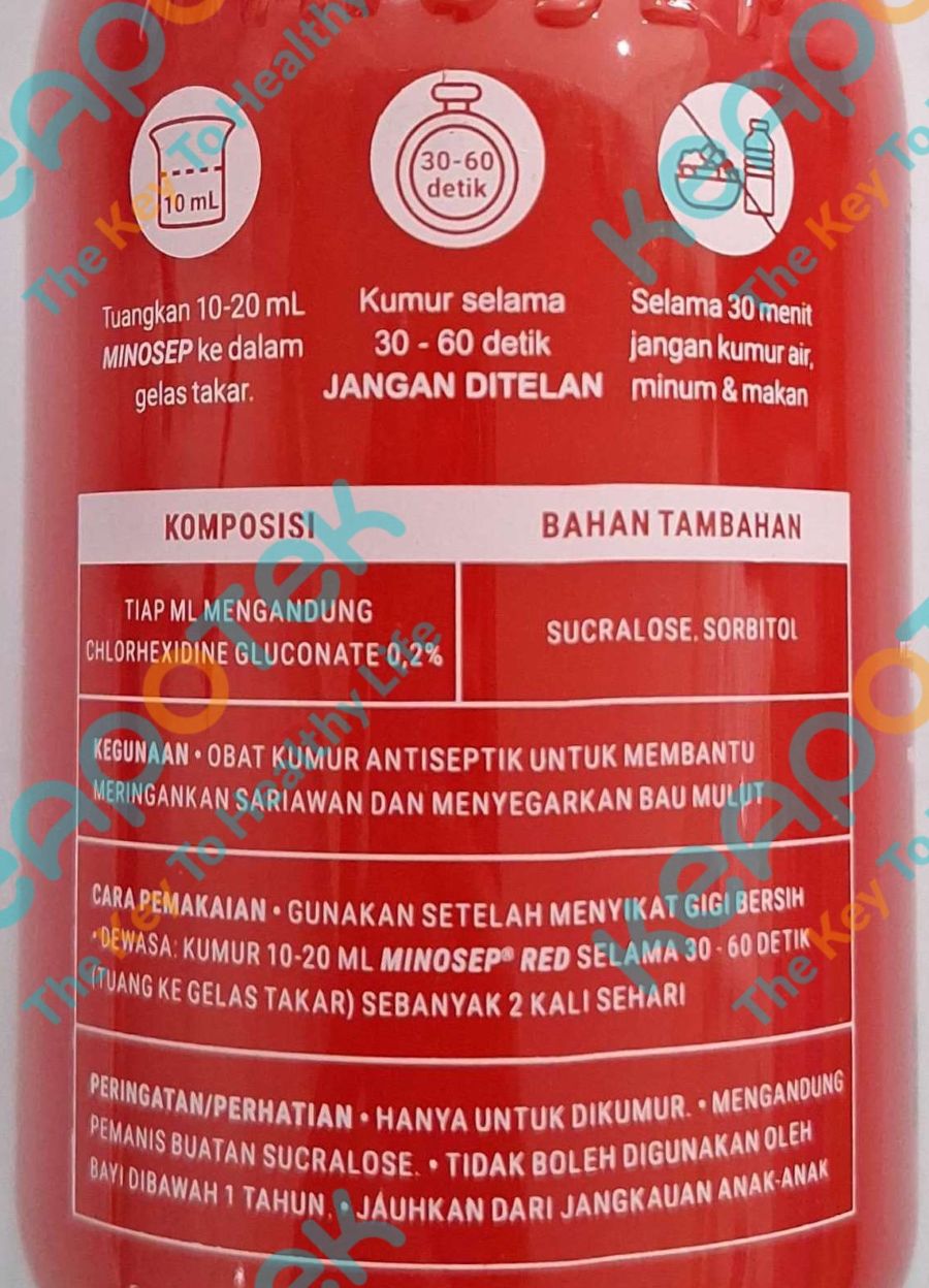 Minosep Obat Kumur mengandung 0,2% Chlorhexidine gluconate yang bekerja sebagai antiseptik pada mulut untuk meringankan sariawan dan membantu menyegarkan mulut.