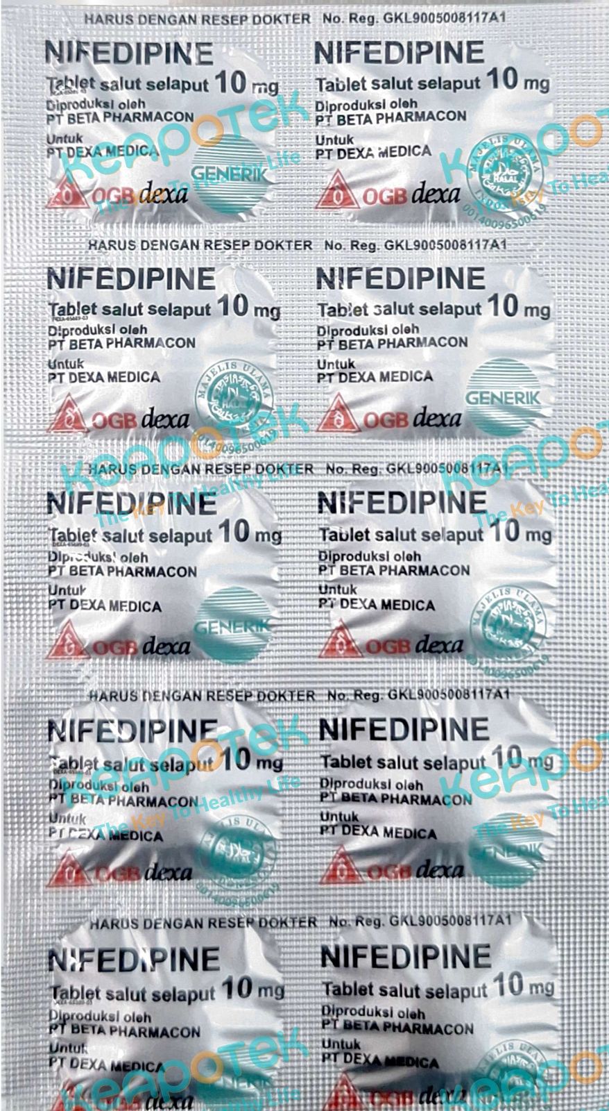 Nifedipine 10 mg merupakan obat yang digunakan untuk mengatasi hipertensi, melebarkan arteri koroner dan sistematik utama yang mengakibatkan tekanan darah turun. Nifedipine menghambat saluran kalsium berpagar tegangan tipe-L yang mengurangi tekanan darah dan meningkatkan pasokan oksigen ke jantung.