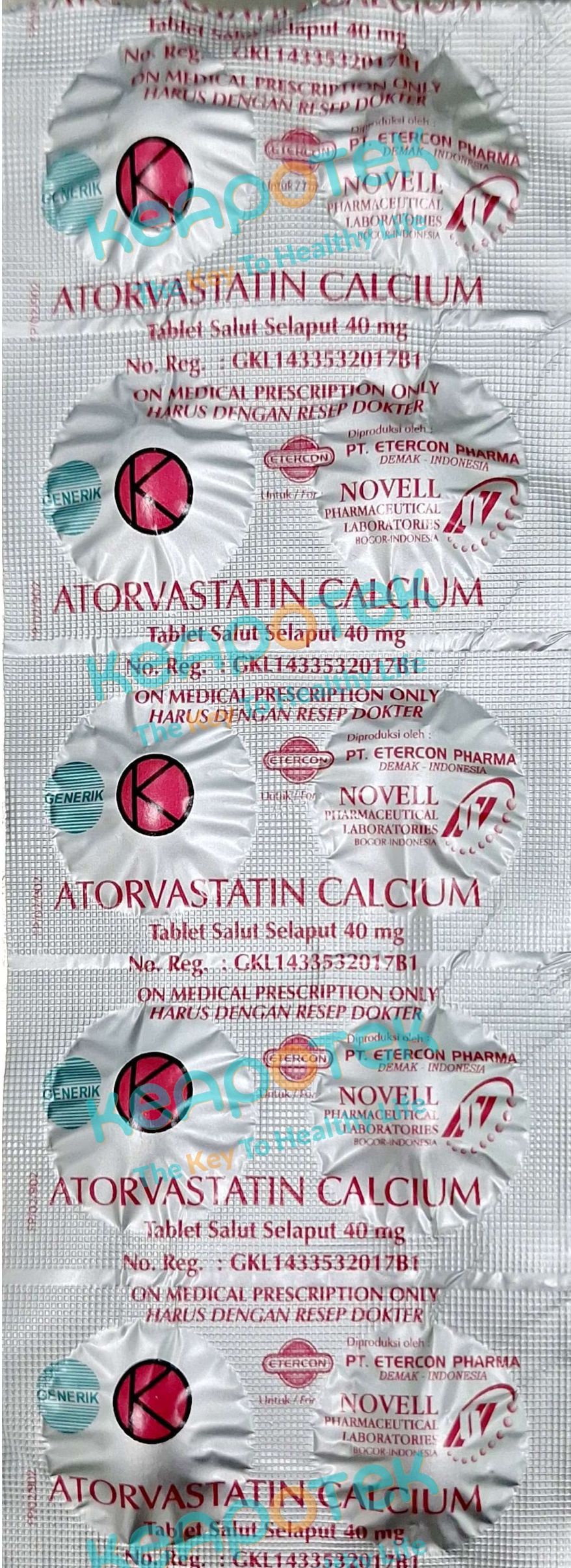 Atorvastatin 40 mg mengandung zat aktif atorvastatin yang merupakan jenis obat golongan penghambat HMG-CoA reduktase atau disebut statin. Atorvastatin secara selektif berkompetisi menghambat enzim HMG-CoA reduktase yang bertanggung jawab terhadap konversi 3-hydroxy-3-methylglutary-coenzyme A menjadi mevalonat yang merupakan prekursor dari sterol-sterol, termasuk kolesterol. Obat ini digunakan sebagai tambahan diet untuk menurunkan peningkatan kolesterol total, kolesterol LDL, apo-B & trigliserida pada pasien dengan hiperkolesterolemia primer, hiperlipidemia kombinasi & homozigot bila respons tehadap diet dan tindakan nonfarmakologis lainnya kurang berhasil.