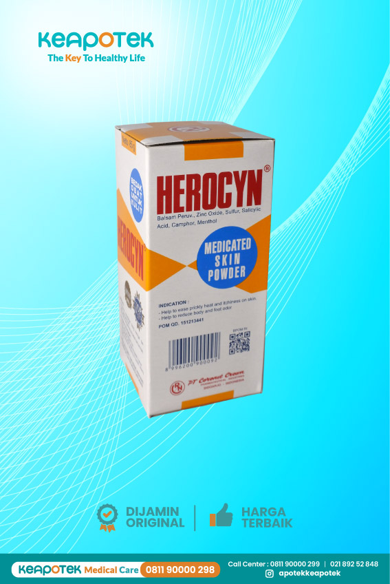 Herocyn Bedak merupakan bedak dengan kandungan Balsam peruv, Zinc oxide, Sulfur, Salicylic acid, Camphor, dan Menthol yang digunakan untuk membantu meredakan gangguan kulit seperti gatal-gatal dan biang keringat.