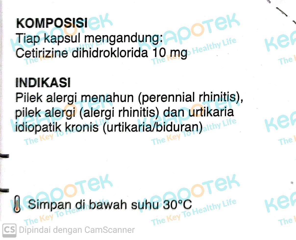dan hidung meler karena alergi. Cetirizine diHCl menghambat produksi histamin saat terjadi reaksi alergi dengan cara menghambat
