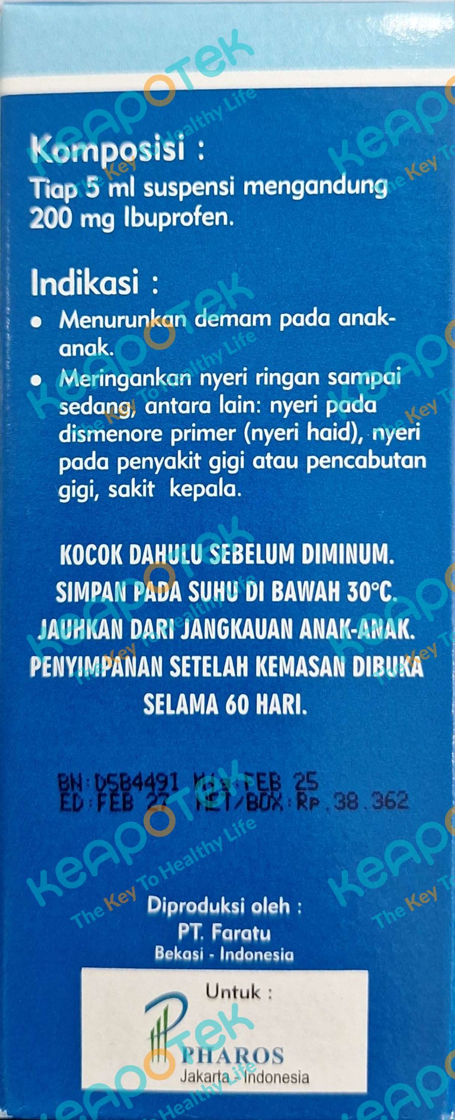 Dosis dewasa untuk meringankan nyeri ringan sampai sedang: 3-4 kali sehari 5 mL. Dosis Anak-anak untuk menurunkan demam dan meringankan nyeri ringan sampai sedang: Usia 3-7 tahun: 3 kali sehari 2,5 mL. Usia 8-12 tahun: 3 kali sehari 5 mL. Aturan pakai: Konsumsi segera setelah makan.