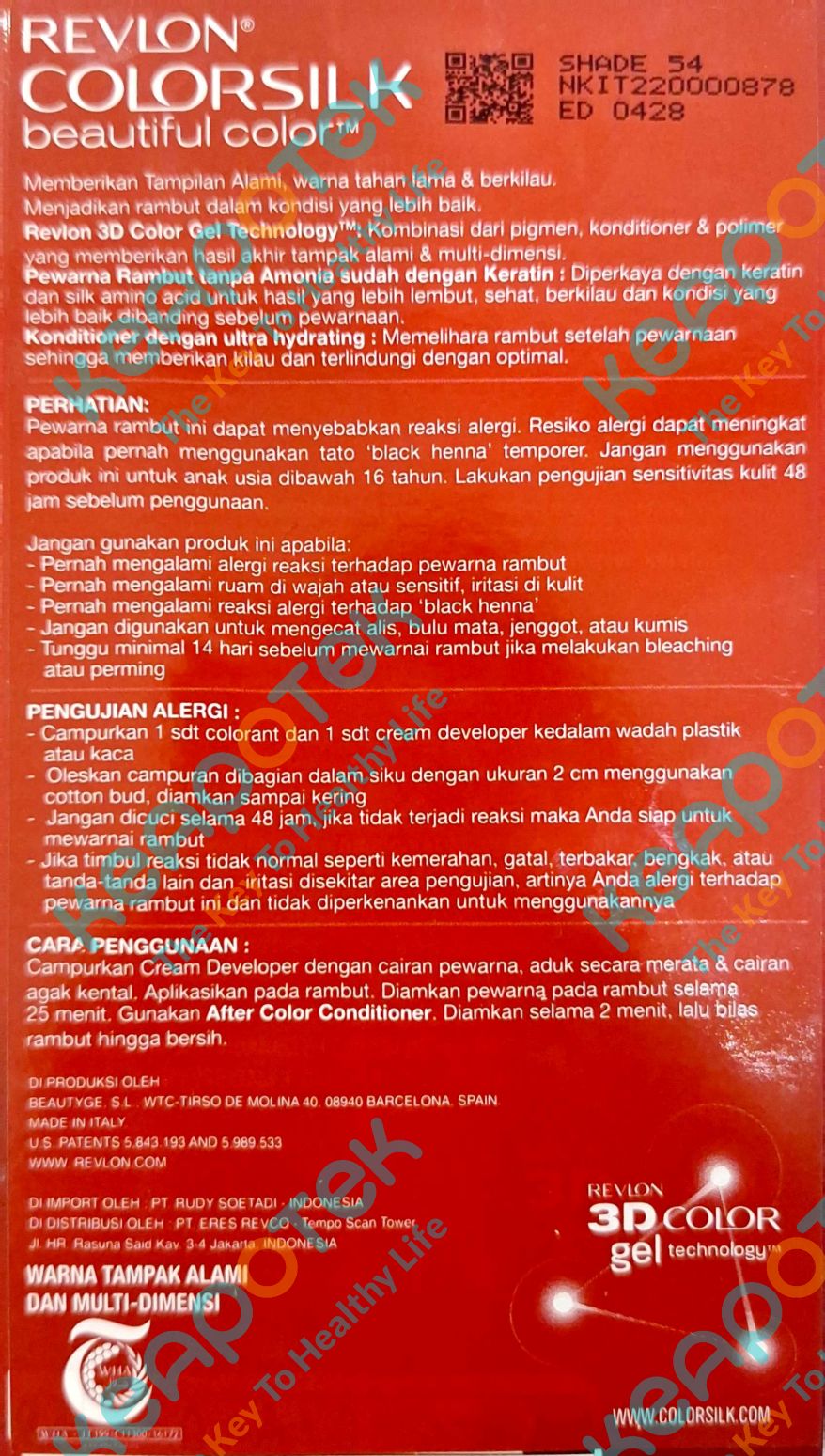 Revlon Colorsilk Beautiful Color shade 54 (Light Golden Brown) merupakan pewarna rambut coklat muda bernuansa keemasan tanpa amonia dengan 3D Color Technology yang menghasilkan warna rambut multidimensi, tahan lama dan tampak alami. Kandungan UV Defense dan Silk protein yang menjaga agar warna tidak cepat pudar, lembut, tetap halus dan berkilau setelah diaplikasikan pada rambut. Satu set pewarna rambut terdiri dari Cream developer dan Cairan pewarna rambut.