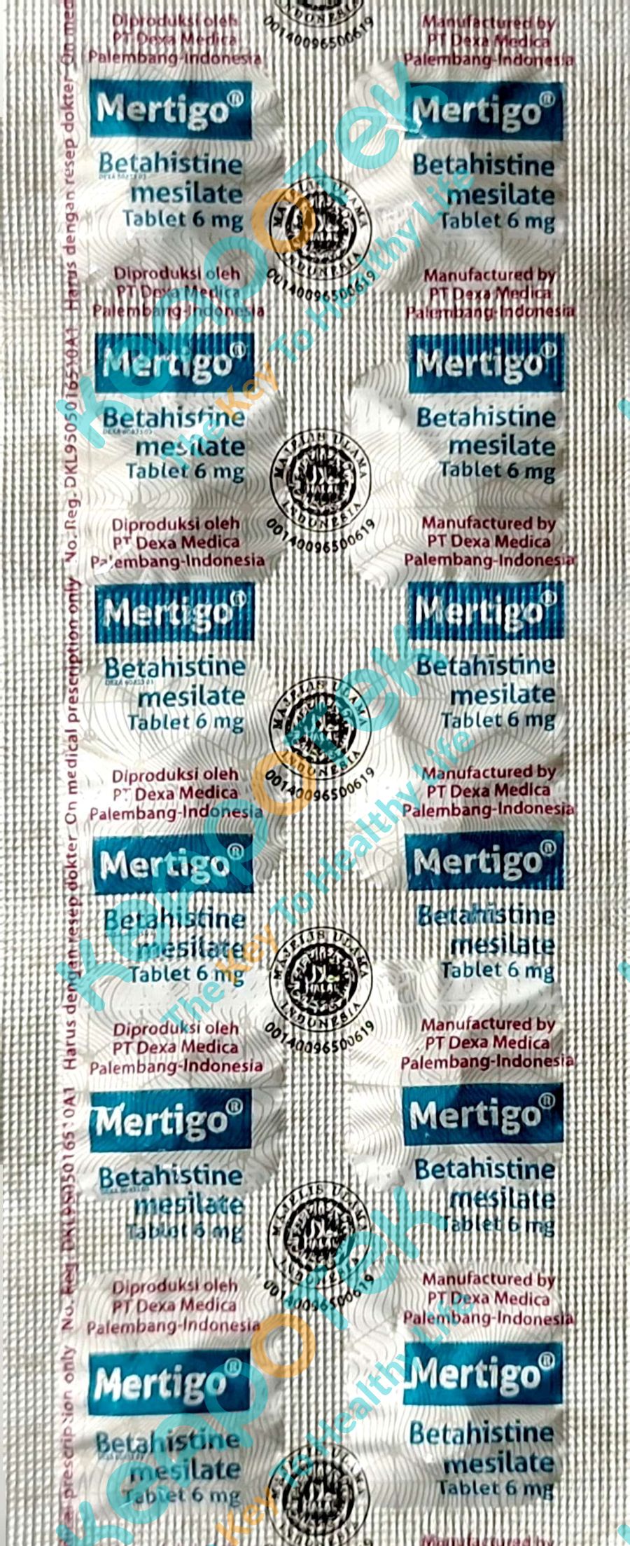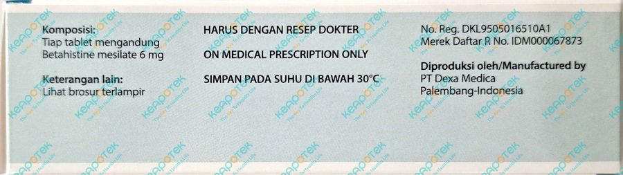 Mertigo 6 mg merupakan obat dengan kandungan Betahistine mesilate 6 mg yang digunakan untuk mengobati vertigo, tinitus dan gangguan pendengaran yang terkait dengan penyakit meniere. Betahistin mesilate adalah analog histamin yang dapat meningkatkan mikrosirkulasi labyrinth menghasilkan peningkatan tekanan endolimpatik. Obat ini bertindak sebagai agonis reseptor H1 parsial histamin dan antagonis reseptor H3 histamin di jaringan neuronal, dengan aktivitas histamin reseptor H2 yang dapat diabaikan. Hal ini dapat menghambat prasinaptik reseptor H3 histamin dan menginduksi downregulation dari reseptor H3, sehingga meningkatkan pergantian dan pelepasan histamin.