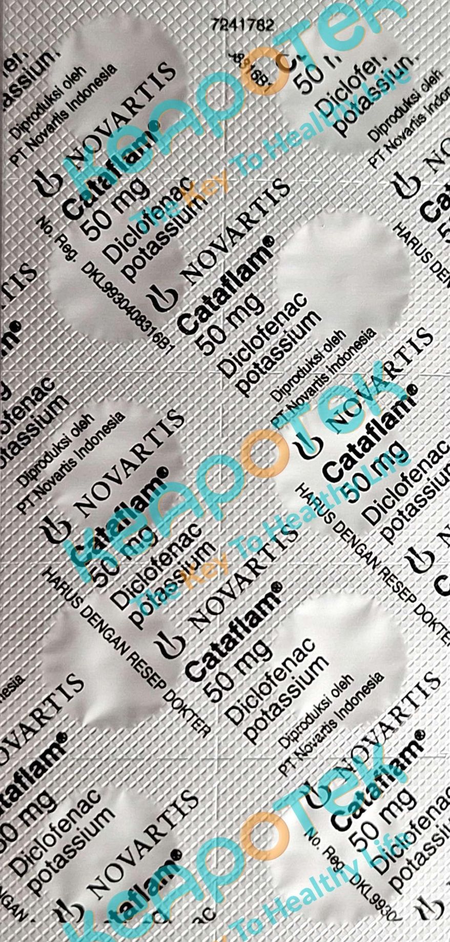 Cataflam 50 mg mengandung Diclofenac Potassium 50 mg yang merupakan obat antiinflamasi non-steroid (NSAID) digunakan untuk mengurangi nyeri dan peradangan. Diclofenac potassium lebih mudah diserap sehingga lebih cocok untuk nyeri akut.