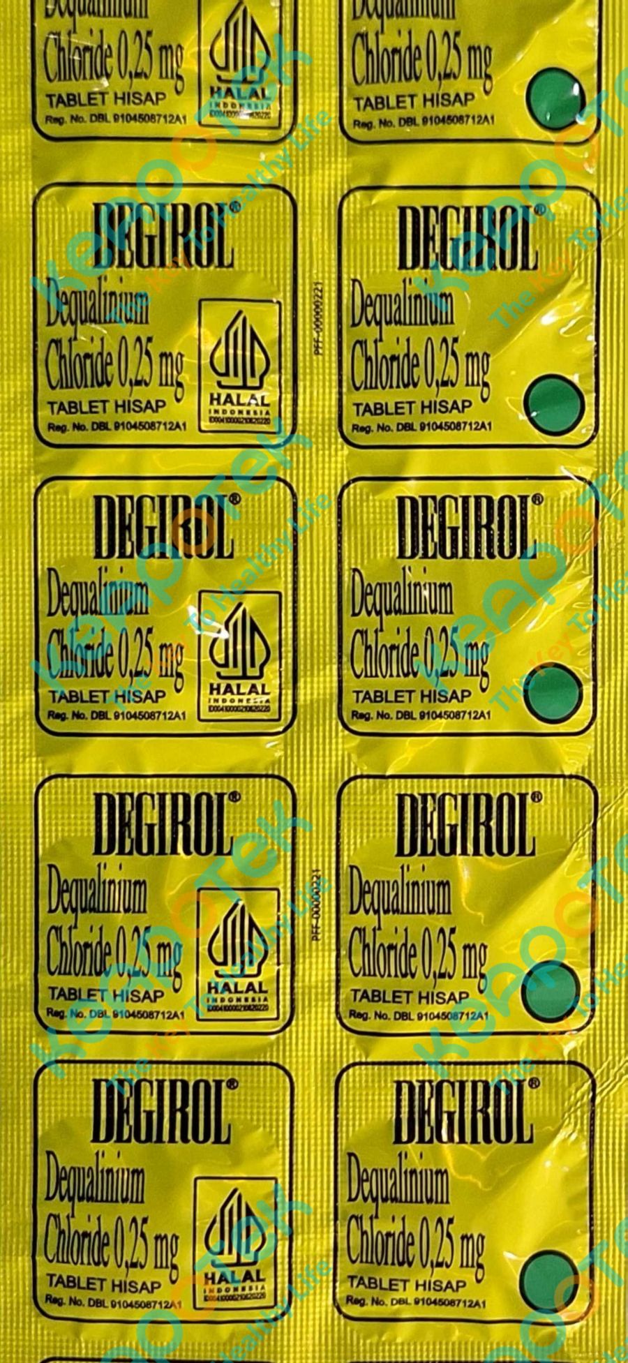 Degirol tablet hisap mengandung Dequalinium Chloride yang digunakan untuk mengobati sakit tenggorokan, peradangan pada rongga mulut dan tenggorokan. Dequalinium adalah obat antiseptik yang melawan pertumbuhan bakteri gram negatif, bakteri gram positif, dan jamur. Dequalinium meningkatkan permeabilitas sel bakteri dan mengurangi aktivitas enzim, sehingga menyebabkan kematian sel.
