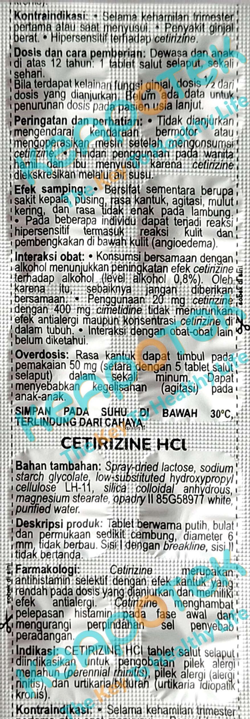 Cetirizine HCl adalah obat antihistamin yang digunakan untuk mengatasi alergi seperti urtikaria, rhinitis alergi, bersin-bersin, dan hidung meler karena alergi. Cetirizine HCl menghambat produksi histamin saat terjadi reaksi alergi dengan cara menghambat reseptor histamin pada saluran perncernaan, pembuluh darah dan saluran pernapasan.