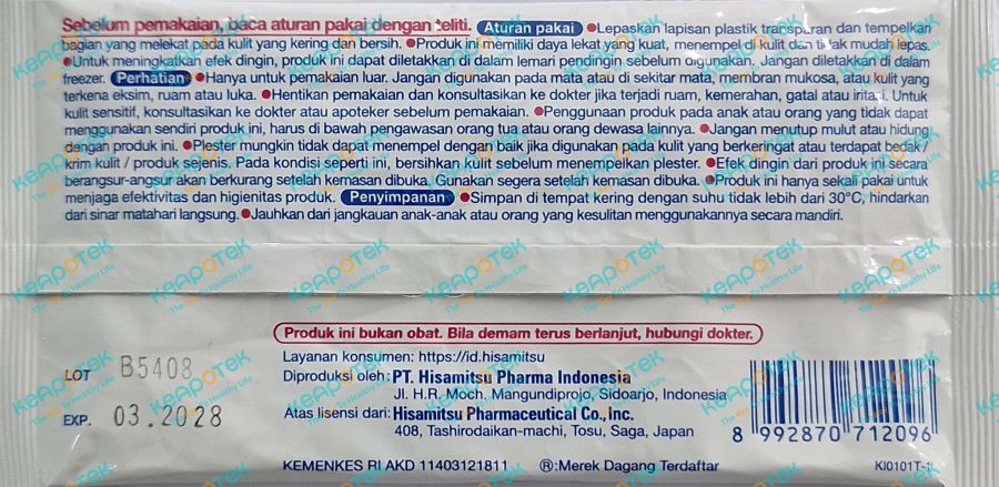 Dosis: Sesuai kebutuhan. Aturan pakai: Lepaskan lapisan plastik transparan dan tempelkan pada bagian yang melekat pada kulit yang kering dan bersih. Untuk meningkatkan efek dingin, produk ini dapat diletakkan di dalam lemari pendingin sebelum digunakan. Jangan diletakkan di dalam freezer.