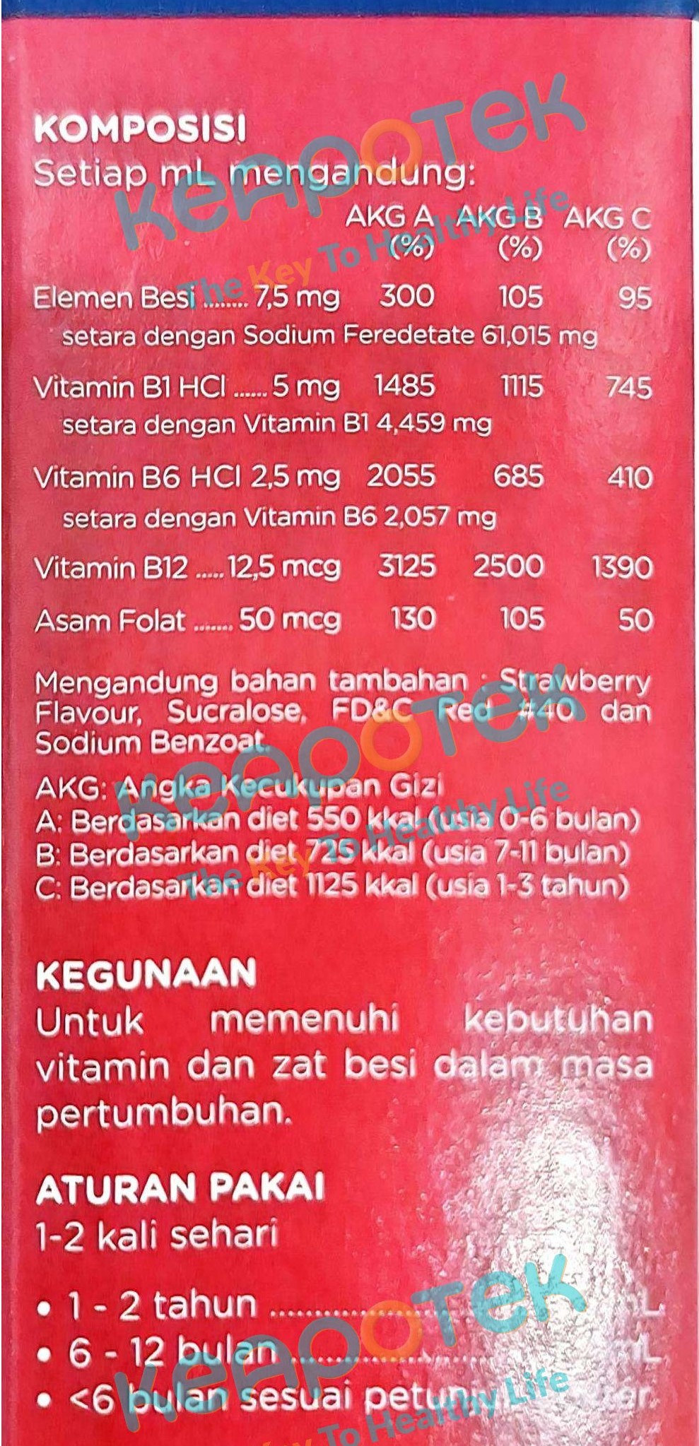Dosis anak 1-2 tahun: 1-2 kali sehari 1,6 mL. Dosis anak 6-12 bulan: 1-2 kali sehari 1,2 mL. Dosis anak < 6 bulan: Sesuai petunjuk dokter. Aturan pakai: Dikonsumsi saat perut kosong atau 1 jam sebelum makan.
