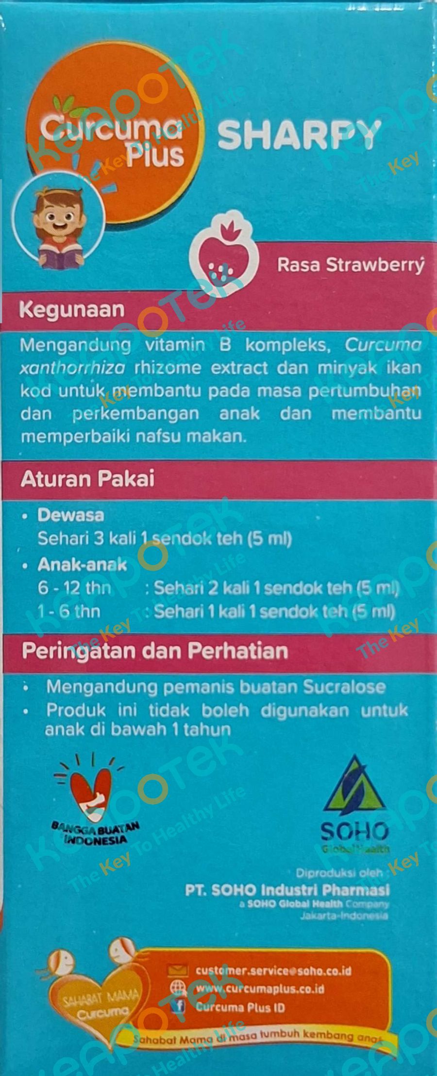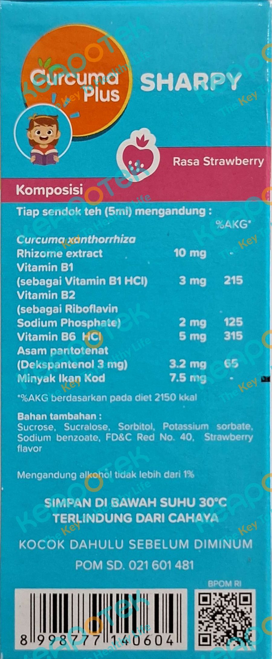 Curcuma Plus Sharpy Rasa Strawberry mengandung temulawak, DHA, prebiotik FOS, beta karoten, serta multivitamin yang digunakan untuk meningkatkan daya tahan tubuh dan nafsu makan, mengoptimalkan fungsi sistem saraf, otak, mata, dan kulit, serta baik untuk kesehatan pencernaan dan mendukung kecerdasan anak.