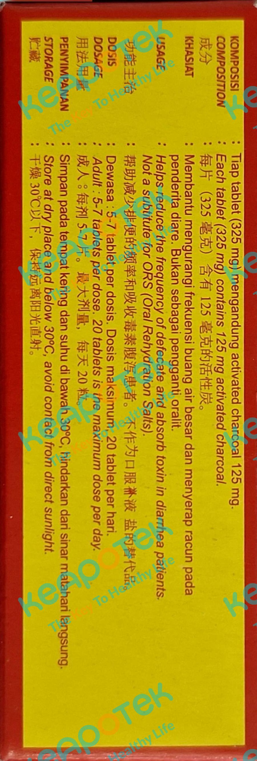 Dosis gangguan pencernaan: 6-9 tablet per 1 kali minum. Dosis keracunan: 20 tablet setiap satu kali minum atau sesuai petunjuk dokter. Aturan pakai: Dikonsumsi sesuai indikasi. Tablet diminum dengan air.
