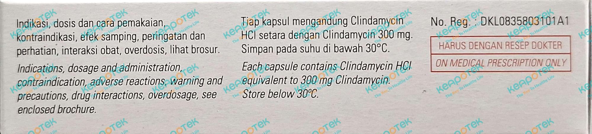 Dosis dewasa: Infeksi cukup serius: 150-300 mg setiap 6 jam. Infeksi serius: 300-450 mg setiap 6 jam. Infeksi Streptococcus β hemolitik: Lanjutkan pengobatan hingga paling tidak 10 hari. Aturan pakai: Dapat diminum dengan atau tanpa makanan. Pastikan untuk menghabiskan obat sesuai dengan resep yang diberikan. Pengobatan yang tidak tuntas menyebabkan risiko bakteri resisten terhadap antibiotik.