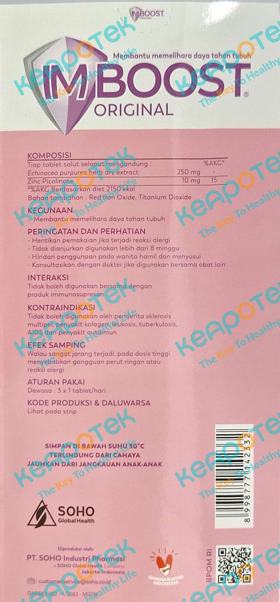 Imboost merupakan suplemen dengan kandungan Echinacea purpurea herb dry extract 250 mg dan Zn Piccolinate 10 mg dalam bentuk tablet salut selaput yang digunakan untuk membantu memelihara daya tahan tubuh.