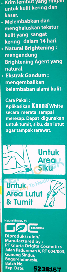 Kanna White mengandung Natural whitening, Lesitin, petrolatum, cetearil alkohol, ceteareth-33, PEG 100, stearate gliseril stearat, natrium bikarbonat, propylene glycol, metil paraben, propyl paraben, air, parfum, protein gandum. Yang diindikasikan untuk Kulit kering , kasar, pecah-pecah; mencerahkan kulit bagian siku, lutut, tumit.