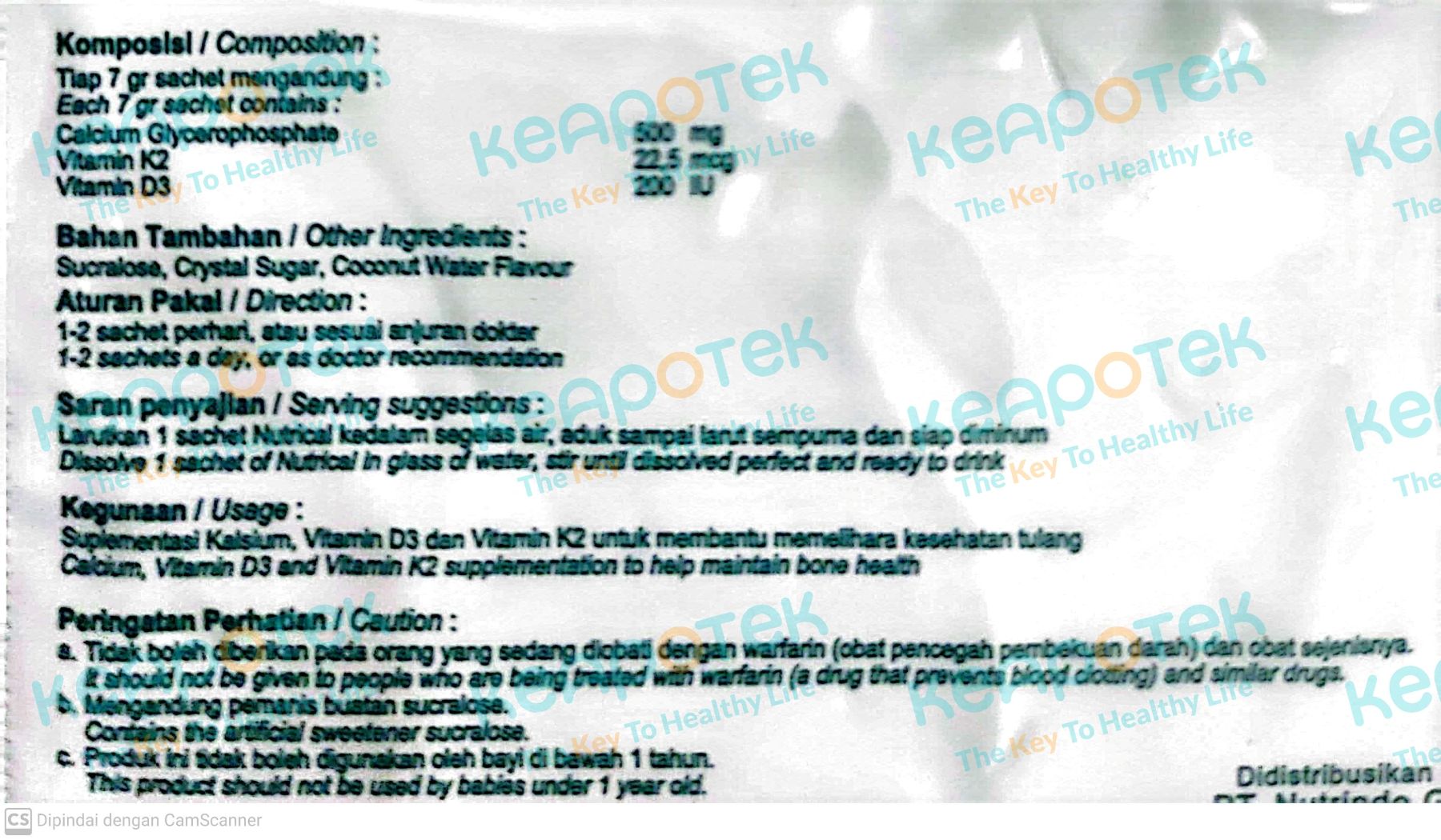 Dosis: 1-2 sachet perhari, atau sesuai anjuran dokter. Aturan pakai: Larutkan 1 sachet Nutrical ke dalam segelas air, aduk sampai larut sempurna dan siap diminum.