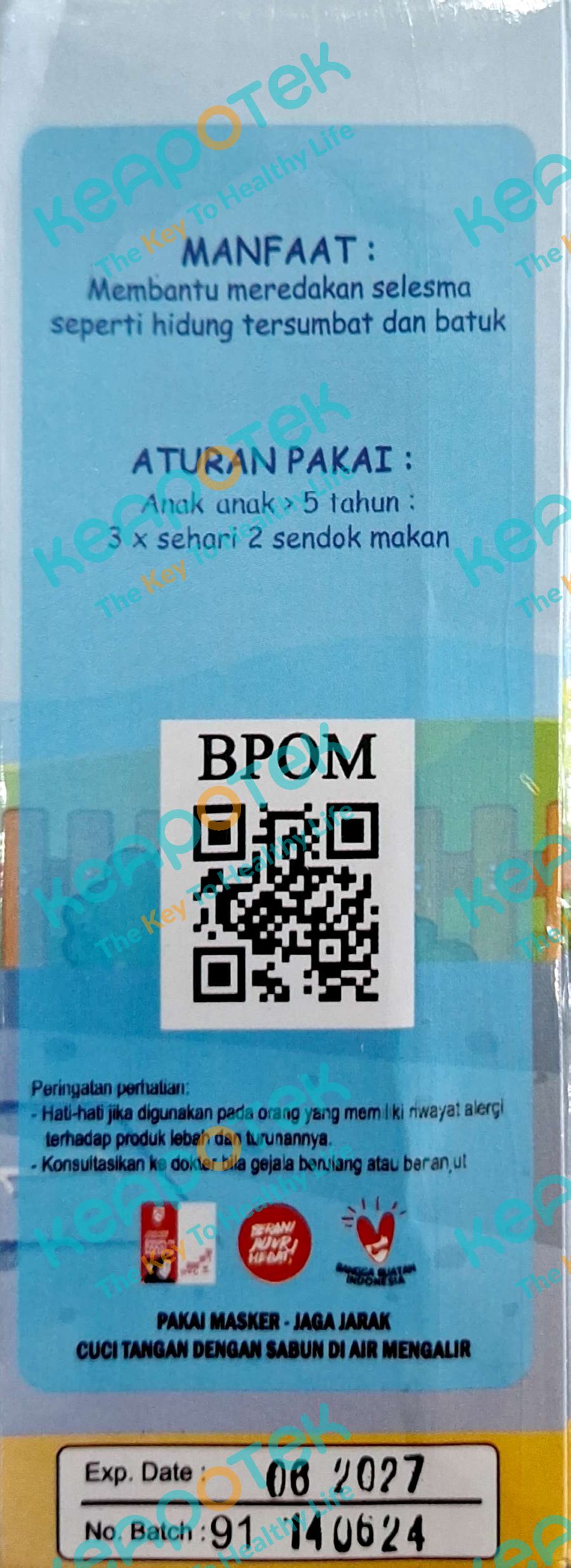 Membantu meredakan flu, pilek, batuk berdahak dan kering, sakit tenggorokan, demam, dan gangguan saluran pernapasan pada anak.